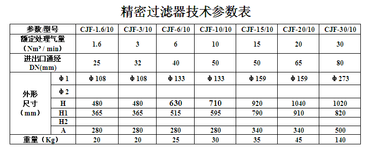 精密過濾器主要是除去壓縮氣中的油、液態水霧、塵。該系列產品具有效率高、使用方便、運行成本低,該產品根據不同的階段分為C/T/A三級。C級過濾精度為≤3μm除99.9%游離狀態的水分;T級過濾精度為≤1μm除99.99%游離狀態的水分;A級過濾精度為≤0.01μm除99.999%游離狀態的水分。