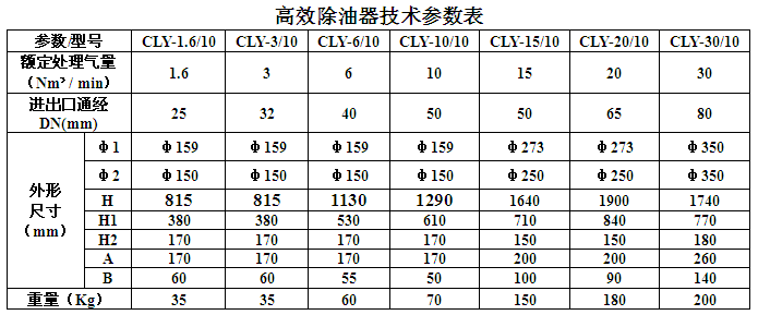 高效除油器由上、下筒體、中間托盤、螺旋分離器、預過濾組件、精過濾組件、儀表及排污組件(圖中未示出)等組成。含有大量懸浮微粒、水及油的壓縮空氣首先進入下筒體,經螺旋分離使液態油、水沉積在底部,經排污組件排出,而氣流轉進入預過濾組件,除去較大的固態、液態微粒;最后氣體進入除油器的核心元件-精濾芯,氣體通過組合濾床的攔截、碰撞、擴散、重力沉降等效應,使微小的油、水氣溶膠粒子在穿過濾床的過程中被捕集在一根根超細纖維的交叉點處凝聚,并逐步長大,最終在重力沉降層中實現氣液分離,從而獲得潔凈(無油、無水、無塵)的壓縮空氣。
